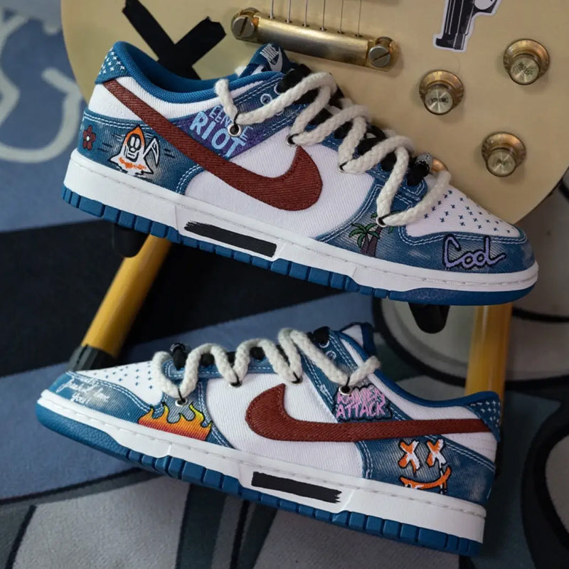 [Custom Patched Rebel] Dunk Low Skateboard Shoes Unisex Denim Style