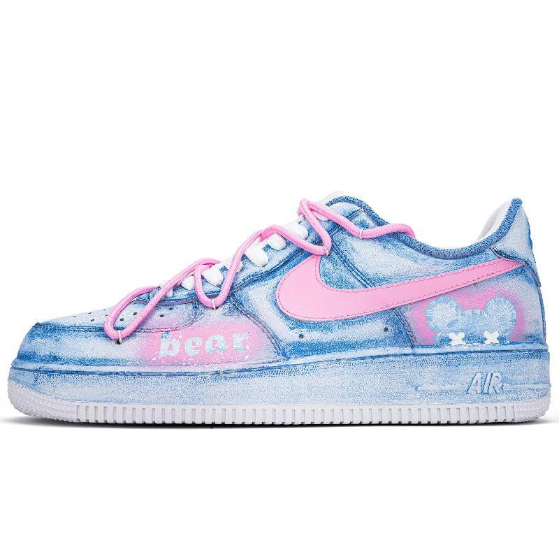 [Custom Blue and pink patch bear]  Air Force 1 Skateboarding Shoes Unisex Low-top Blue/pink
