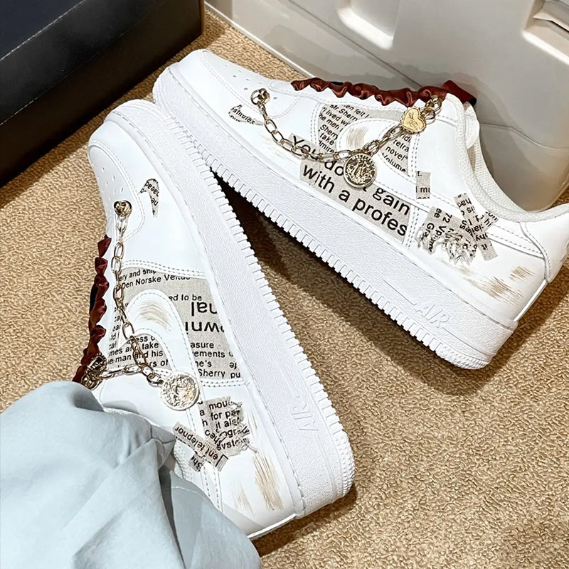 [Custom Men's vintage old newspaper in white and brown]  Air Force 1 Skateboarding Shoes Men Low-top Light Khaki